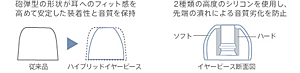 2種類の硬度のシリコンを組み合わせた、ハイブリッドシリコンイヤーピースを採用。