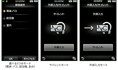 リスニング環境に合わせて選べる3つのモード(電車 ・ バス/航空機 ・ 室内)。
